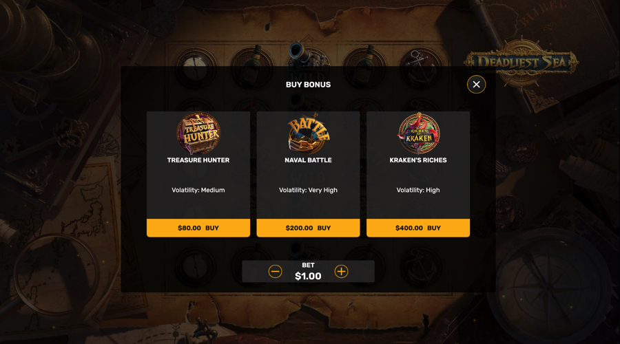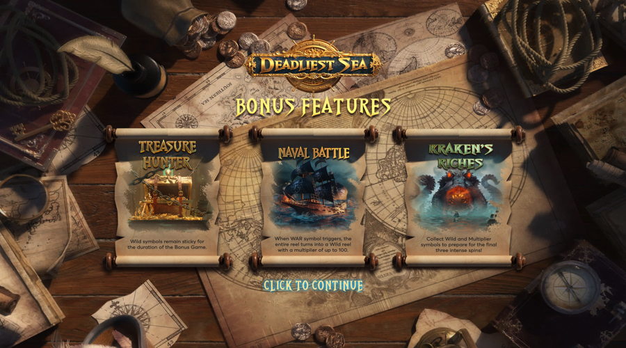 Navak összecsapás A játék a rivális hajók elleni csatákra összpontosít, ahol extra nyeremények jelennek meg az összecsapás kibontakozásával. A Kraken ajándéka a játékteret víz alá mozgatja, és speciális szimbólumokat ad hozzá, amelyek nagy fix nyereményeket hozhatnak létre.